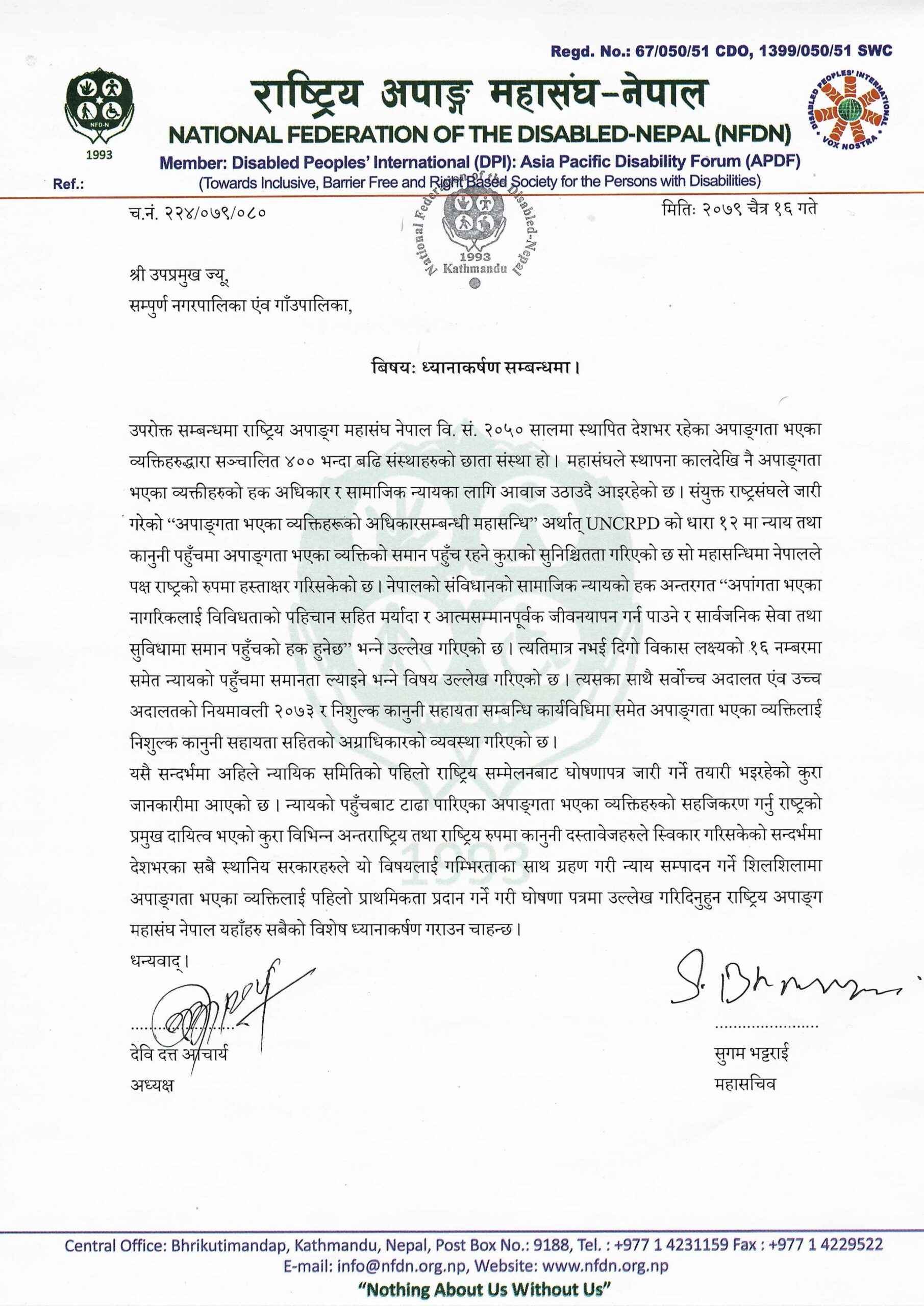 यसै सन्दर्भमा अहिले न्यायिक समितिको पहिलो राष्ट्रिय सम्मेलनबाट घोषणापत्र जारी गर्ने तयारी भइरहेको कुरा जानकारीमा आएको छ । न्यायको पहुँचबाट टाढा पारिएका अपाङ्गता भएका व्यक्तिहरुको सहजिकरण गर्नु राष्ट्रको प्रमुख दायित्व भएको कुरा विभिन्न अन्तराष्ट्रिय तथा राष्ट्रिय रुपमा कानुनी दस्तावेजहरुले स्विकार गरिसकेको सन्दर्भमा देशभरका सबै स्थानिय सरकारहरुले यो विषयलाई गम्भिरताका साथ ग्रहण गरी न्याय सम्पादन गर्ने शिलशिलामा अपाङ्गता भएका व्यक्तिलाई पहिलो प्राथमिकता प्रदान गर्ने गरी घोषणा पत्रमा उल्लेख गरिदिनुहुन राष्ट्रिय अपाङ्ग महासंघ नेपाल यहाँहरु सबैको विशेष ध्यानाकर्षण गराउन चाहन्छ ।
