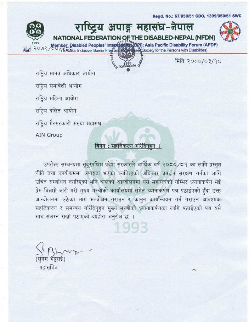 सुदूरपश्चिम प्रदेश सरकारले आर्थिक वर्ष २०८०/८१ का लागि प्रस्तुत नीति तथा कार्यक्रममा अपाङ्गता भएका व्यक्तिहको अधिकार सम्बन्धी महासन्धी, नेपालको संविधान, अपाङ्गता भएका व्यक्तिको अधिकार सम्बन्धी ऐन २०७४, को भावना बिपरित सोहि प्रदेशमा बसोबास गर्ने करिब ७०,००० भन्दा बढी अपाङ्गता भएका व्यक्तिहरुको न्यूनतम आवश्यकताहरूलाई समेत सम्बोधन नगरीएको प्रति तपसिलमा उल्लेखित संघ संस्थाहरुको गम्भिर ध्यानाकर्षण भएको छ ।