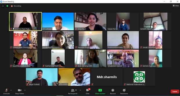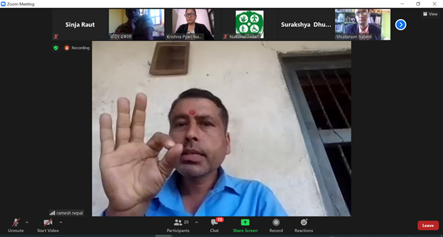 समावेशी कोभिड १९ व्यवस्थापनका लगि स्थानीय अभियान्ताहरुको क्षमता विकास गर्न र उनीहरूको जनवकालतका कामहरूलाइ प्रभावकारी बनाउन यस तालिम आयोजना गरिएको हो । विभिन्न प्रकारका अपाङ्गता भएका व्यक्तिहरुलाई एकै स्थलबाट प्राविधिक माध्यम “जूम” प्रयोग गरी तालिम सन्चालन भएको हो । यस तालिममा सिन्धुपाल्चोकको ईन्द्रावती र हेलम्बु नगरपालिका, र काभ्रेको मन्डनदेउपुर र भुम्लु नगरपालिकाको अपाङ्गता भएका व्यक्तिहरुको संघ संस्थाको प्रतिनिधिहरुको सहभागीता रहेको थियो । १८ (९ महिला, ९ पुरुष) जनाले सहभागीता जनाएका थिए ।
