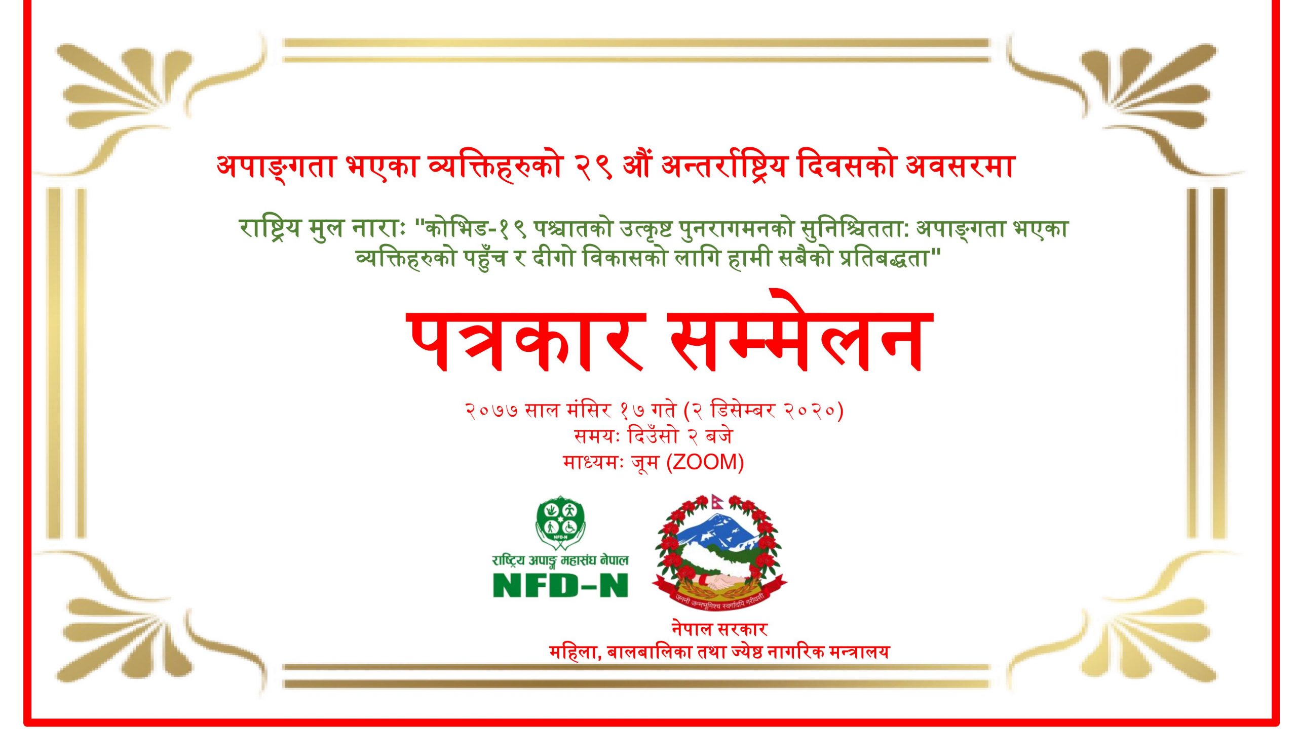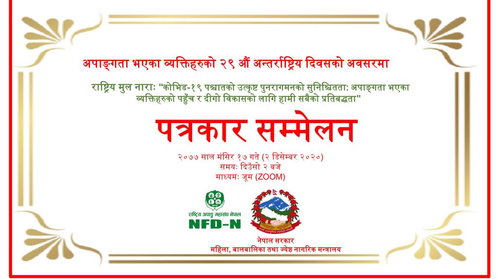 २९ औं अन्तर्राष्ट्रिय अपाङ्गता दिवसको उपलक्ष्यमा महिला, बालबालिका र वरिष्ठ नागरिक मन्त्रालयले मंसिर १७ गते राष्ट्रिय अपाङ्ग महासंघ नेपाल (एनएफडीएन) सँगको समन्वयमा एक भर्चुअल प्रेस बैठक आयोजना गर्यो । जूम प्लेटफर्ममा सन्चालित प्रेस बैठकमा राष्ट्रिय मिडिया, अपाङ्गता भएका व्यक्तिहरुको संस्था, संघीय र प्रादेशिक समितिका पदाधिकारीको उपस्थिति थियो। प्रेस बैठकमा महासचिव राजु बस्नेतले अपाङ्गता क्षेत्रमा वर्षौंको उपलब्धीमा प्रकाश पार्दै अपाङ्गताका मुद्दाहरूलाई सामूहिक रूपमा सम्बोधन गर्नुपर्ने बताउनुभयो ।