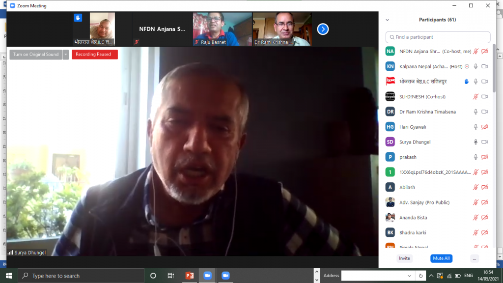 यसैबीच राष्ट्रिय मानवअधिकार आयोगका सहसचिव नवराज सापकोटाले दिगो विकासका लक्ष्य र अपाङ्गता भएका व्यक्तिका अधिकारको अवस्था विषयमा प्रस्तुती दिनुभएको थियो जसमा दिगो विकासका लक्ष्यहरुको उपलब्धीमा अपाङ्गता भएका व्यक्तिहरुको विभिन्न सूचाङ्कहरु समेटिएको थियो यसैविच महामारीको समयमा अपाङ्गता भएका व्यक्तिहरुको अधिकारको अवस्था र दिगो विकासको लक्ष्यहरुको विषयमा प्रस्तुती दिनुहुदैँ राष्ट्रिय अपाङ्ग महासंघका महासचिव राजु बस्नेतले पहुँचयुक्त सूचनाको अभाव, स्वास्थ्य सेवामा पहुँच नहुनु, रोजगारीको अवसरबाट बञ्चिती लगायत विभिन्न समस्याका कारण अपाङ्गता भएका व्यक्तिहरुलाई दैनिक जिवनयापनमा कठिनाई भएकोले सरोकारवाला सबैले महामारीमा अपाङ्गता भएका व्यक्तिहरुको बाँच्न पाउने अधिकारको सुनिश्चित गर्दै आधारभुत आवश्यकताको प्रत्याभुती प्रदान गरिनुपर्नेमा ध्यानाकर्षण गराउनु भयो । प्रस्तुतीकै क्रममा उहाँले राष्ट्रिय मानवअधिकार आयोगबाट महासंघले गरेका अपेक्षाहरु पनि उल्लेख गर्नुभएको थियो । जसमा कोभिडबाट प्रभावित अपाङ्गता भएका व्यक्तिलाई प्राथमिकता दिई सेवा उपलब्ध गराउन सिफारिश, अपाङ्गता भएका व्यक्तिहरुको अधिकार सम्बन्धी महासन्धीको कार्यान्वयनमा संयुक्त अनुगमन, अपाङ्गता भएका व्यक्तिका मानवअधिकार हननका मुद्धाको द्रुत मार्गबाट सम्बोधन, म्याराकस ट्रिटीको अनुमोदनमा सहजीकरण, मानव अधिकारमा आधारित तथ्याङ्क संकलन र व्यवस्थापनमा जोड दिनुपर्ने लगायत रहेका छन् ।