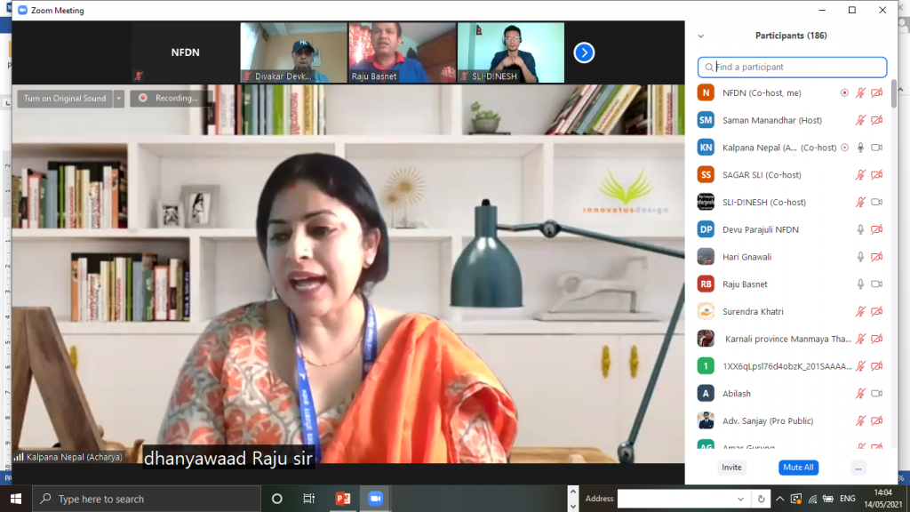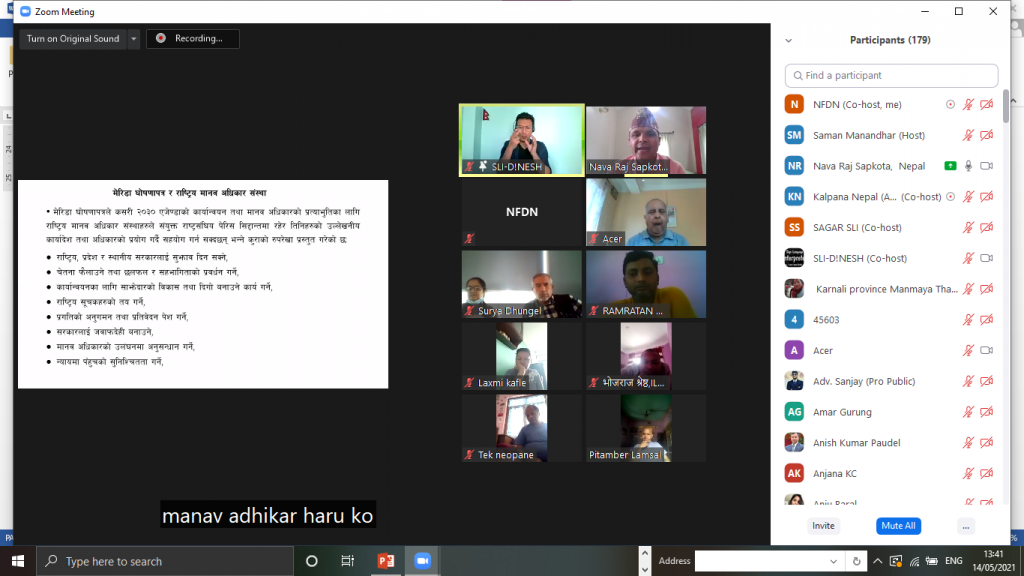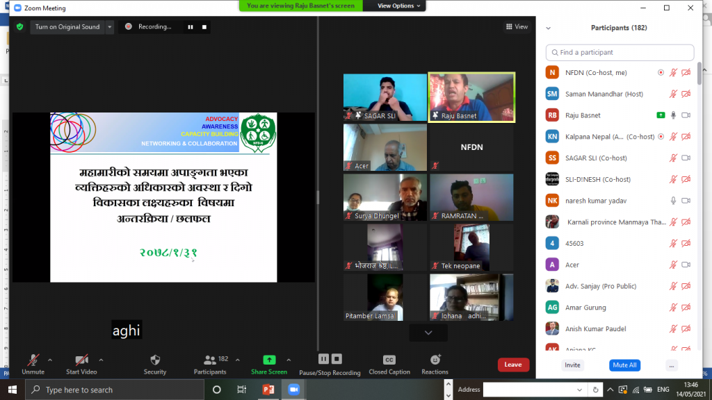 कोरोना महामारीको संकटमा अपाङ्गता भएका व्यक्तिहरुको अधिकारको अवस्था र दिगो विकासका लक्ष्यहरुका सवालहरुमा भचुअल माध्यमबाट साक्षत्कार गर्ने उद्देश्यले राष्ट्रिय मानव अधिकार आयोगको आयोजना र राष्ट्रिय अपाङ्ग महासंघ नेपालको समन्वयमा मिति २०७८/०१/३१ मा सरकारी तथा गैरसरकारी सरोकारवाला निकायहरुबीच अन्तरकृया/छलफल कार्यक्रम सम्पन्न भएको छ ।