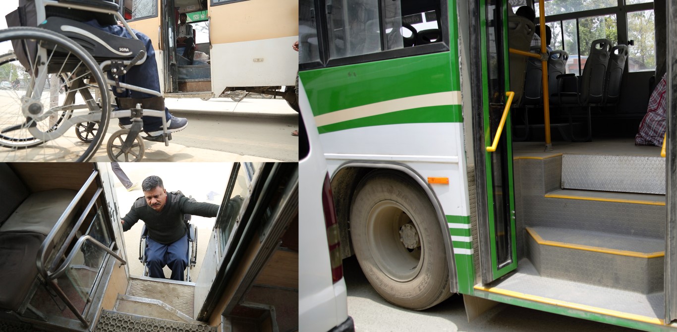 ३. चित्रमा देखाए जस्तै यहाँ चल्ने सार्वजनिक यातायातका साधनहरू अपाङ्गता मैत्री छैनन् । जसको परिणाम स्वरूप उनीहरू सार्वजनिक यातायातको प्रयोगमा ठूलो सास्ती भोग्दै आइरहेका छन् । यद्यपि साझा यातायातले काठमान्डौ उपत्यकामा केही समय अघि देखि ह्विलचियर र्याम्प सहितका १६ ओटा ठूला गाडि सञ्चालन गरिरहेको छ जुन पर्याप्त छैनन् ।
