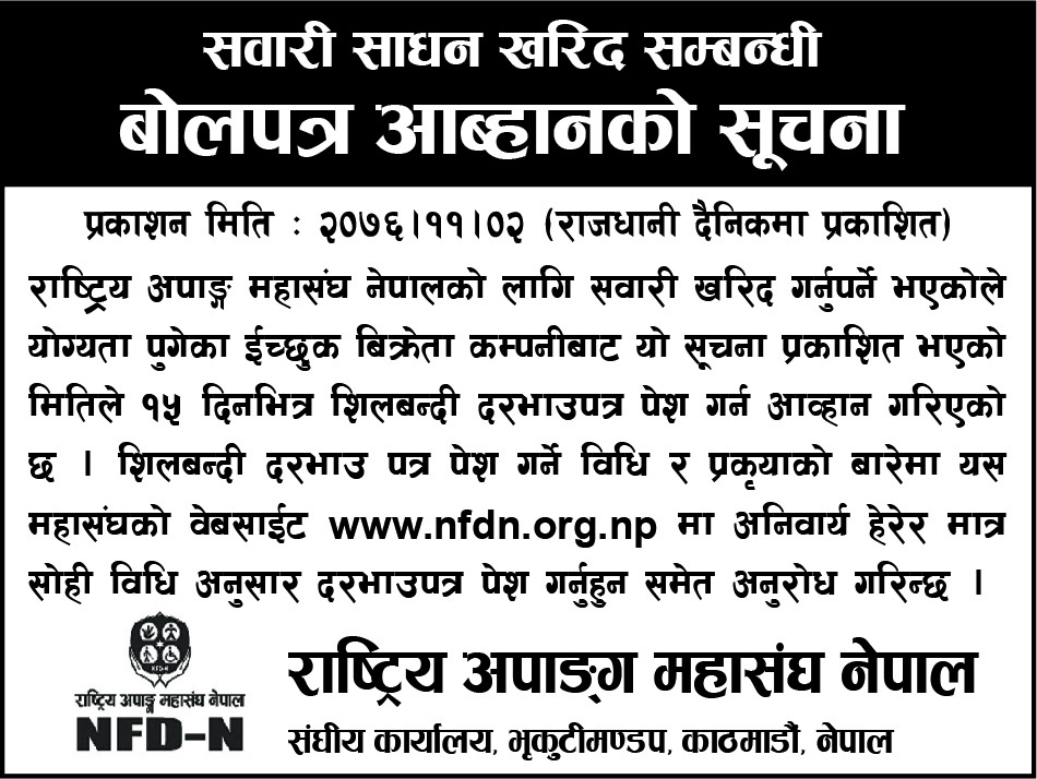 राष्ट्रिय अपाङ्ग महासंघ नेपाललाई कार्यालय प्रयोजनका लागि सवारी साधनको आवश्यकता परेको हुनाले देहायबमोजिमको विस्तृत प्राविधिक विवरण भएको सवारी साधन खरिद गर्नु परेकोले इच्छुक आयकर र मूल्य अभिवृद्धि करमा दर्ता भएका इजाजत प्राप्त फर्म वा कम्पनीहरुबाट यो सूचना प्रकाशित भएको मितिले १५ दिनभित्र तपसिलका शर्तहरुको अधिनमा रही शिलबन्दी बोलपत्र आह्वान गरिएको छ ।