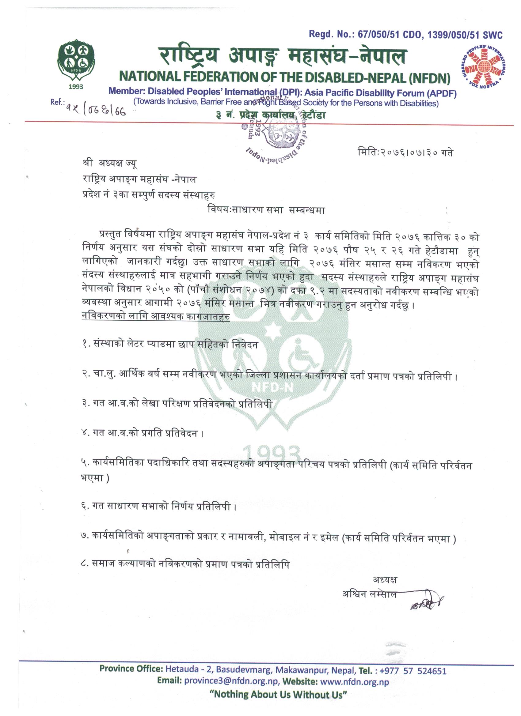 प्रस्तुत विषयमा राष्ट्रिय अपाङ्ग महासंघ नेपाल-प्रदेश नं ३ कार्य समितिको मिति २०७६ कात्तिक ३० को निर्णय अनुसार यस संघको दोस्रो साधारण सभा यहि मिति २०७६ पौष २५ र २६ गते हेटौडामा हुन् लागिएको जानकारी गर्दछु । उक्त साधारण सभाको लागि २०७६ मंसिर मसान्त सम्म नविकरण भएको संदस्य संस्थाहरुलाई मात्र सहभागी गराउने निर्णय भएको हुदा सदस्य संस्थाहरुले राष्ट्रिय अपाङ्ग महासंघ नेपालको विधान २०५० को (पाँचौ संशोधन २०७४) को दफा ९.२ मा सदस्यताको नवीकरण सम्बन्धी भएको व्यवस्था अनुसार आगामी २०७६ मंसिर मसान्त भित्र नवीकरण गराउनु हुन अनुरोध गर्दछु ।