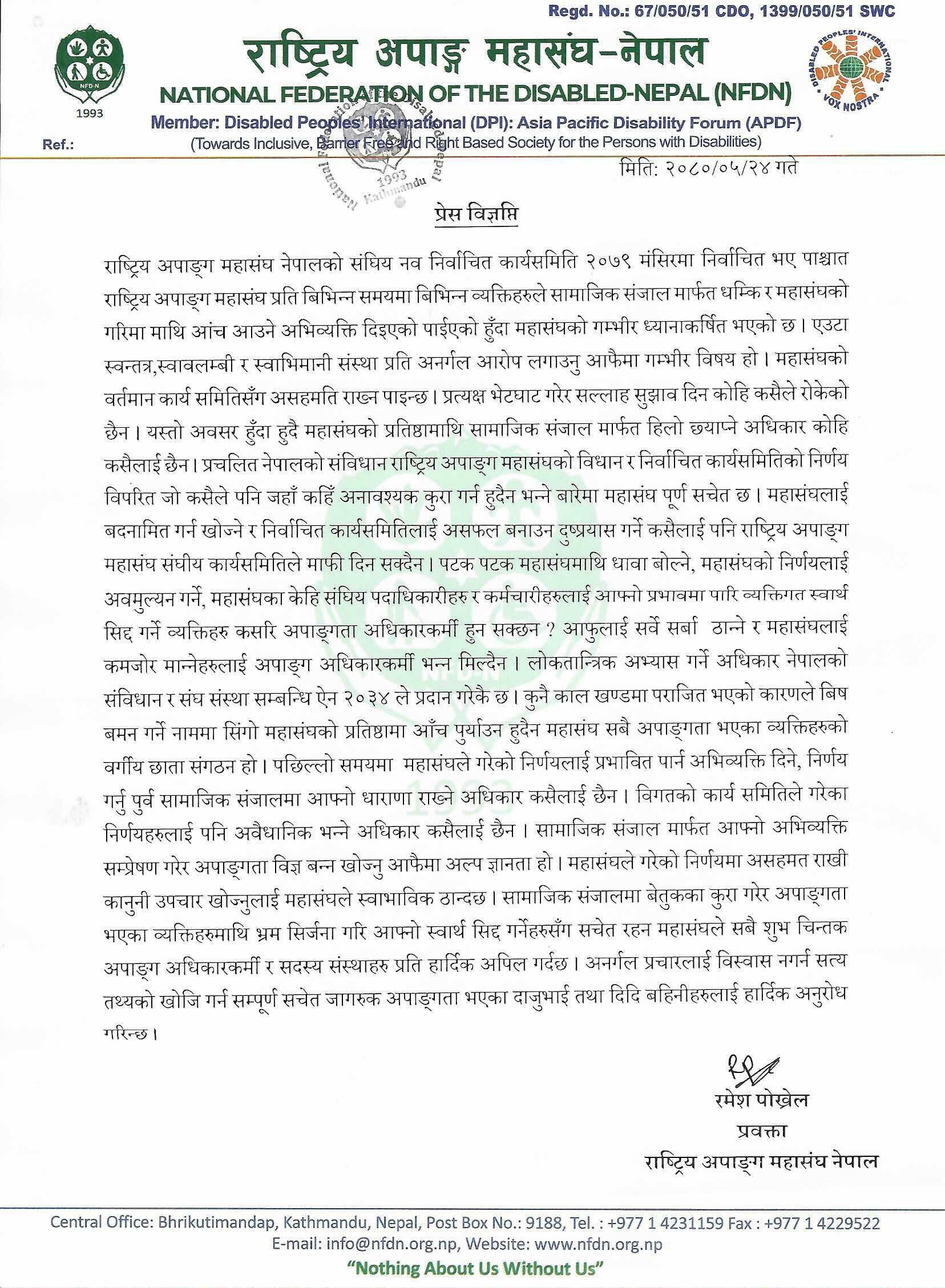 राष्ट्रिय अपाङ्ग महासंघ नेपालको संघिय नव निर्वाचित कार्यसमिति २०७९ मंसिरमा निर्वाचित भए पाश्चात राष्ट्रिय अपाङ्ग महासंघ प्रति बिभिन्न समयमा बिभिन्न व्यक्तिहरुले सामाजिक संजाल मार्फत धम्कि र महासंघको गरिमा माथि आंच आउने अभिव्यक्ति दिइएको पाईएको हुँदा महासंघको गम्भीर ध्यानाकर्षित भएको छ । एउटा स्वन्तत्र,स्वावलम्बी र स्वाभिमानी संस्था प्रति अनर्गल आरोप लगाउनु आफैमा गम्भीर विषय हो । महासंघको वर्तमान कार्य समितिसँग असहमति राख्न पाइन्छ । प्रत्यक्ष भेटघाट गरेर सल्लाह सुझाव दिन कोहि कसैले रोकेको छैन । यस्तो अवसर हुँदा हुदै महासंघको प्रतिष्ठामाथि सामाजिक संजाल मार्फत हिलो छ्याप्ने अधिकार कोहि कसैलाई छैन । प्रचलित नेपालको संविधान राष्ट्रिय अपाङ्ग महासंघको विधान र निर्वाचित कार्यसमितिको निर्णय विपरित जो कसैले पनि जहाँ कहिँ अनावश्यक कुरा गर्न हुदैन भन्ने बारेमा महासंघ पूर्ण सचेत छ । महासंघलाई बदनामित गर्न खोज्ने र निर्वाचित कार्यसमितिलाई असफल बनाउन दुष्प्रयास गर्ने कसैलाई पनि राष्ट्रिय अपाङ्ग महासंघ संघीय कार्यसमितिले माफी दिन सक्दैन । पटक पटक महासंघमाथि धावा बोल्ने, महासंघको निर्णयलाई अवमुल्यन गर्ने, महासंघका केहि संघिय पदाधिकारीहरु र कर्मचारीहरुलाई आफ्नो प्रभावमा पारि व्यक्तिगत स्वार्थ सिद्द गर्ने व्यक्तिहरु कसरि अपाङ्गता अधिकारकर्मी हुन सक्छन ? आफुलाई सर्वे सर्बा ठान्ने र महासंघलाई कमजोर मान्नेहरुलाई अपाङ्ग अधिकारकर्मी भन्न मिल्दैन । लोकतान्त्रिक अभ्यास गर्ने अधिकार नेपालको संविधान र संघ संस्था सम्बन्धि ऐन २०३४ ले प्रदान गरेकै छ । कुनै काल खण्डमा पराजित भएको कारणले बिष बमन गर्ने नाममा सिंगो महासंघको प्रतिष्ठामा आँच पुर्याउन हुदैन महासंघ सबै अपाङ्गता भएका व्यक्तिहरुको वर्गीय छाता संगठन हो । पछिल्लो समयमा महासंघले गरेको निर्णयलाई प्रभावित पार्न अभिव्यक्ति दिने, निर्णय गर्नु पुर्व सामाजिक संजालमा आफ्नो धाराणा राख्ने अधिकार कसैलाई छैन । विगतको कार्य समितिले गरेका निर्णयहरुलाई पनि अवैधानिक भन्ने अधिकार कसैलाई छैन । सामाजिक संजाल मार्फत आफ्नो अभिव्यक्ति सम्प्रेषण गरेर अपाङ्गता विज्ञ बन्न खोज्नु आफैमा अल्प ज्ञानता हो । महासंघले गरेको निर्णयमा असहमत राखी कानुनी उपचार खोज्नुलाई महासंघले स्वाभाविक ठान्दछ । सामाजिक संजालमा बेतुकका कुरा गरेर अपाङ्गता भएका व्यक्तिहरुमाथि भ्रम सिर्जना गरि आफ्नो स्वार्थ सिद्द गर्नेहरुसँग सचेत रहन महासंघले सबै शुभ चिन्तक अपाङ्ग अधिकारकर्मी र सदस्य संस्थाहरु प्रति हार्दिक अपिल गर्दछ । अनर्गल प्रचारलाई विस्वास नगर्न सत्य तथ्यको खोजि गर्न सम्पूर्ण सचेत जागरुक अपाङ्गता भएका दाजुभ