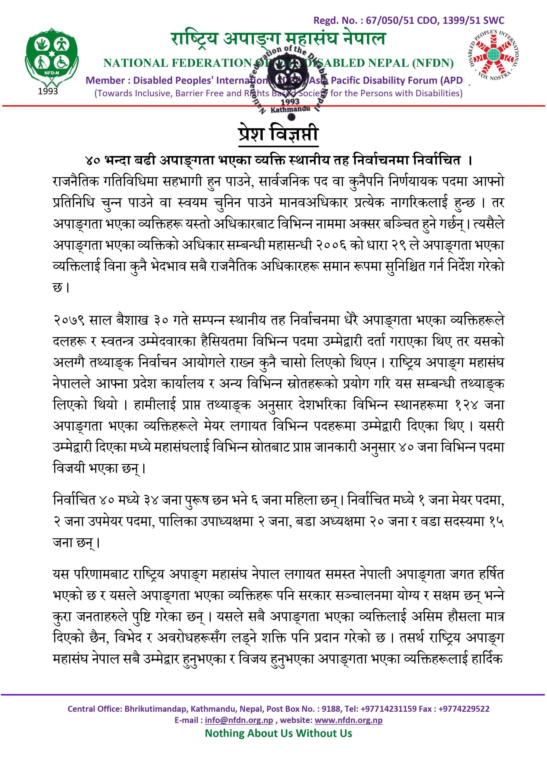 २०७९ साल बैशाख ३० गते सम्पन्न स्थानीय तह निर्वाचनमा धेरै अपाङ्गता भएका व्यक्तिहरूले दलहरू र स्वतन्त्र उम्मेदवारका हैसियतमा विभिन्न पदमा उम्मेद्वारी दर्ता गराएका थिए तर यसको अलग्गै तथ्याङ्क निर्वाचन आयोगले राख्न कुनै चासो लिएको थिएन । राष्ट्रिय अपाङ्ग महासंघ नेपालले आफ्ना प्रदेश कार्यालय र अन्य विभिन्न स्रोतहरूको प्रयोग गरि यस सम्बन्धी तथ्याङ्क लिएको थियो । हामीलाई प्राप्त तथ्याङ्क अनुसार देशभरिका विभिन्न स्थानहरूमा १२४ जना अपाङ्गता भएका व्यक्तिहरूले मेयर लगायत विभिन्न पदहरूमा उम्मेद्वारी दिएका थिए । यसरी उम्मेद्वारी दिएका मध्ये महासंघलाई विभिन्न स्रोतबाट प्राप्त जानकारी अनुसार ४० जना विभिन्न पदमा विजयी भएका छन् ।