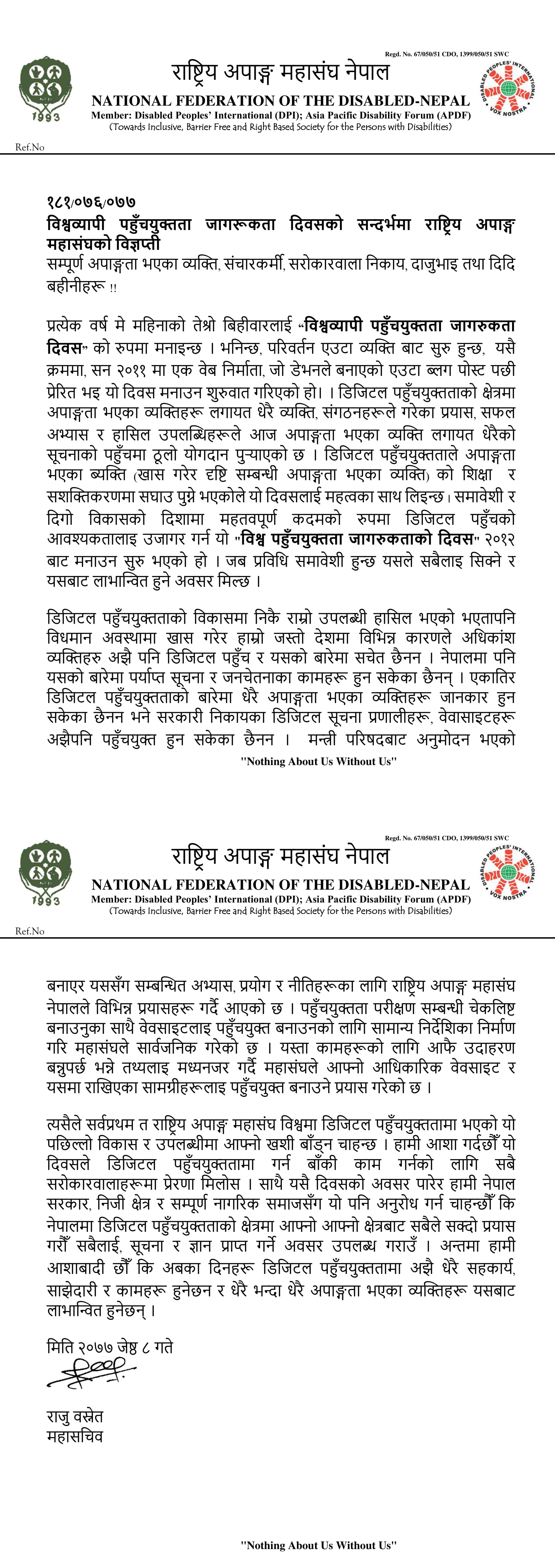 विश्वव्यापी पहुँचयुक्तता जागरूकता दिवसको सन्दर्भमा राष्ट्रिय अपाङ्ग महासंघ नेपालको विज्ञप्ती