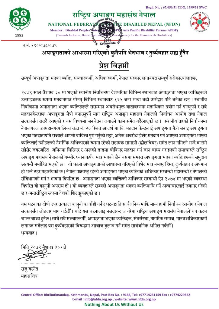 स्थानीय तहको निर्वाचनमा नेपालगञ्ज उपमहानगरपालिका वडा नं. २० स्थित आदर्श मा.वि. मतदान केन्द्रलाई अपाङ्गता मैत्री बनाइ अपाङ्गता भएका मतदाताप्रति राज्यले आफ्नो दायित्व पुरा गर्नुको सट्टा, अनेक अवरोध झेलेर मतदान गर्न आएका अपाङ्गता भएका व्यक्तिलाई उनीहरूको नैशर्गिक अधिकारको रूपमा रहेको सहायक सामाग्री (ह्वीलचियर) समेत लान नमिल्ने भन्दै बाटोमै खोसेर जबरजस्ति जमिनमा घिस्रिएर र अरूको ढाडमा बोकिएर मतदान गर्न जान बाध्य गराइएको समाचारले राष्ट्रिय अपाङ्ग महासंघ नेपालको गम्भीर ध्यानाकर्षण मात्र भएको छैन यसमा समस्त अपाङ्गता भएका व्यक्तिहरूको समुदाय अत्यन्तै मर्माहित भएको छ ।